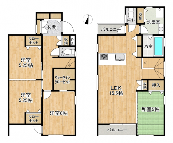 築浅!2階リビング15.5帖・エアコン有り!3口コンロのシステムキッチン・食洗機・追焚き機能・浴室乾燥機機能有り!収納豊富!ウォークインクローゼット有り!敷地内駐車場2台有り! |